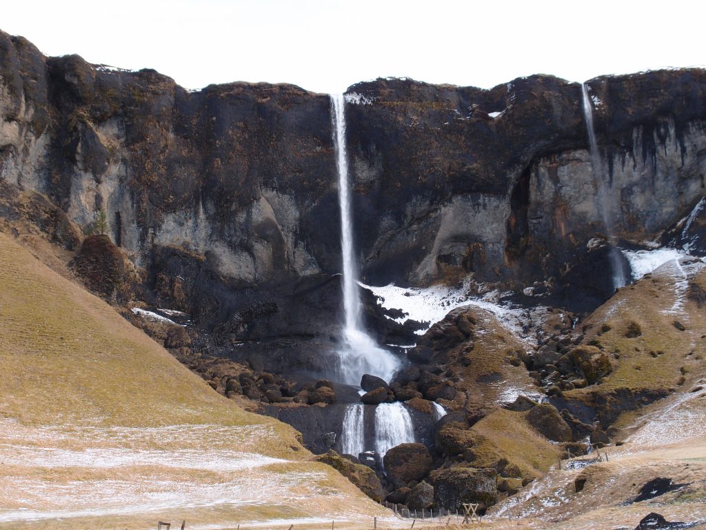 Uns war klar, dass wir hinter den Wasserfall laufen und ihn von hinten umrunden konnten. Das wollten wir uns natürlich nicht nehmen lassen. Was uns zu diesem Zeitpunkt allerdings noch nicht ganz klar war, ist, dass eine windige Regenfront auf uns zukam, sodass der Regen sowie der starke kalte Wind im Zusammenspiel mit den großen Mengen an Wasser des Seljalandsfoss-Wasserfalles uns bis auf die Knochen (inkl. Kamera) durchweichen würde. Dennoch war es absolut imposant, die gefrorenen Grashalme auf dem Weg zum Wasserfall zu sehen und hinter ihm stehend zu spüren, mit welcher Wucht das Wasser herunter strömte.