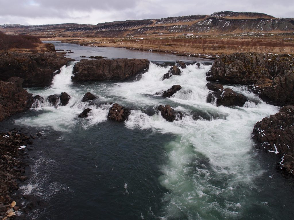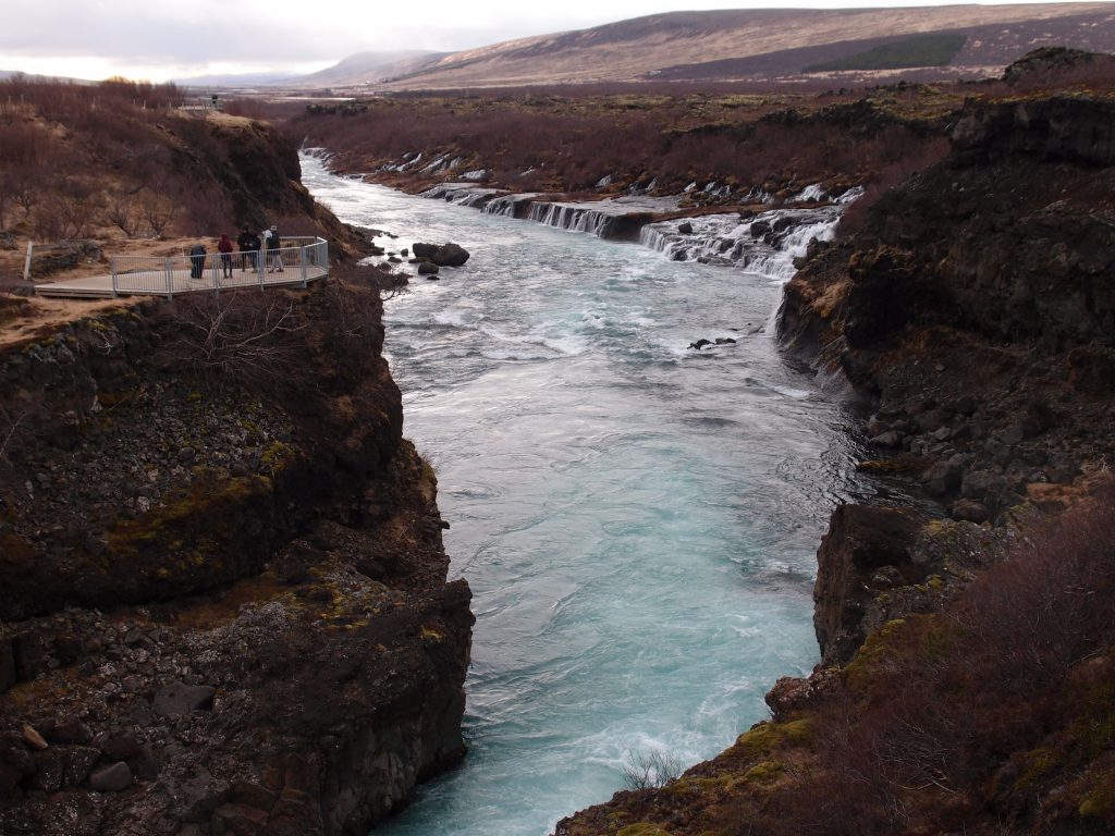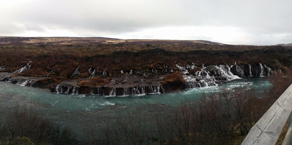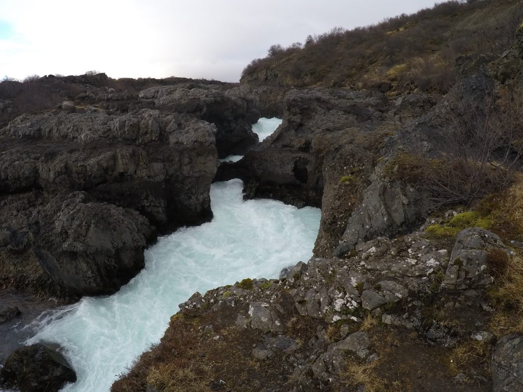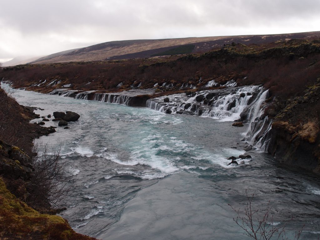 Abschließend besichtigten wir die Hraunfossar. Hunderte kleine Wasserfälle kommen hier aus dem Lavagestein, ohne dass darüber ein Fluss erkennbar ist.