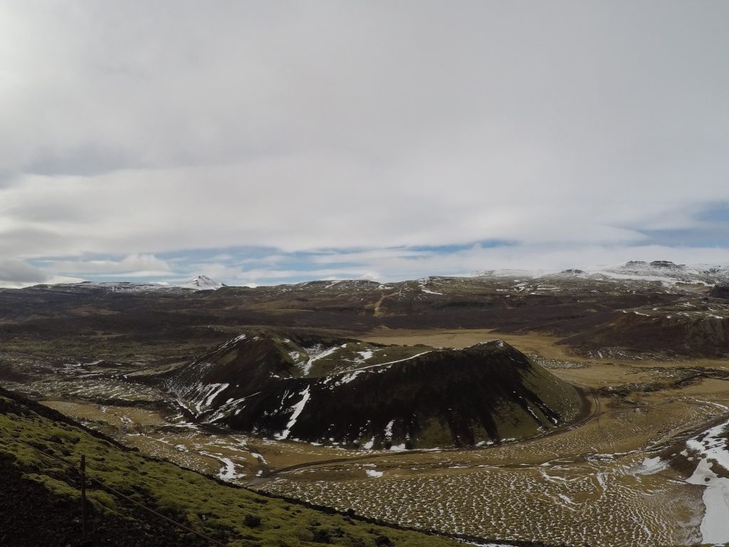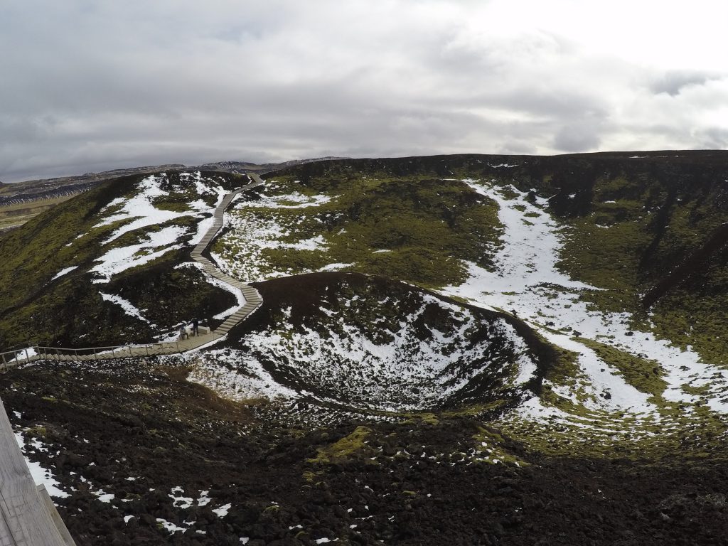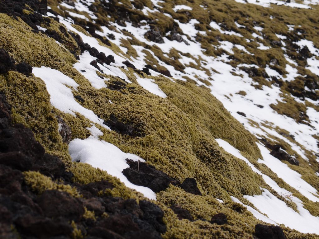 Von dort aus fuhren wir zum Krater Grábrók, wo ich insbesondere das Farbspiel zwischen saftig hellgrünem Moos, rot-schwarzem Lavagestein und strahlend weißem Schnee bewunderte.