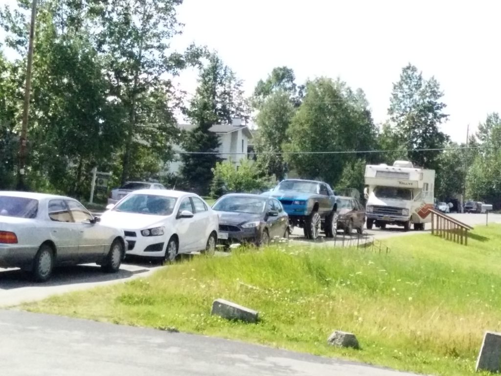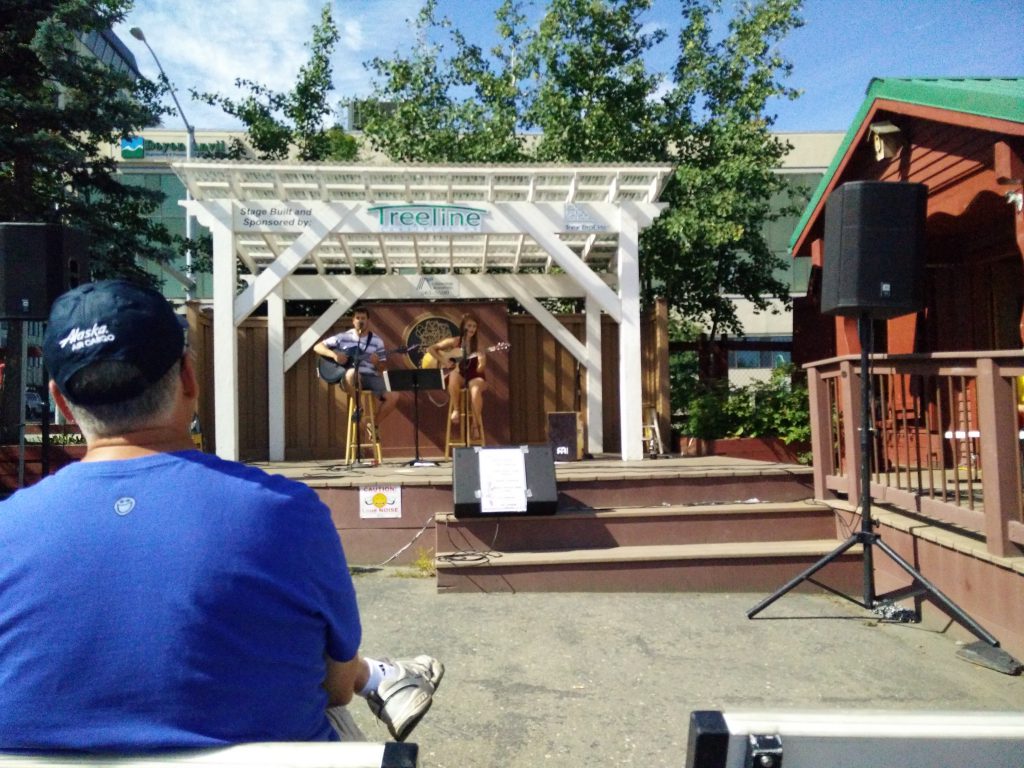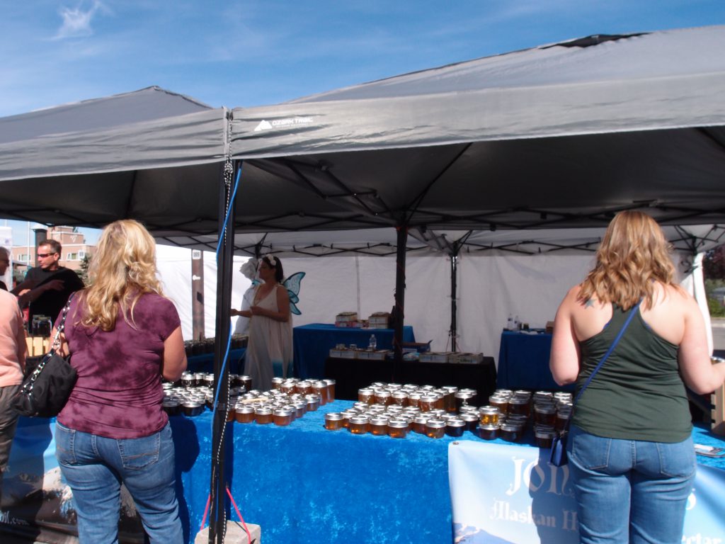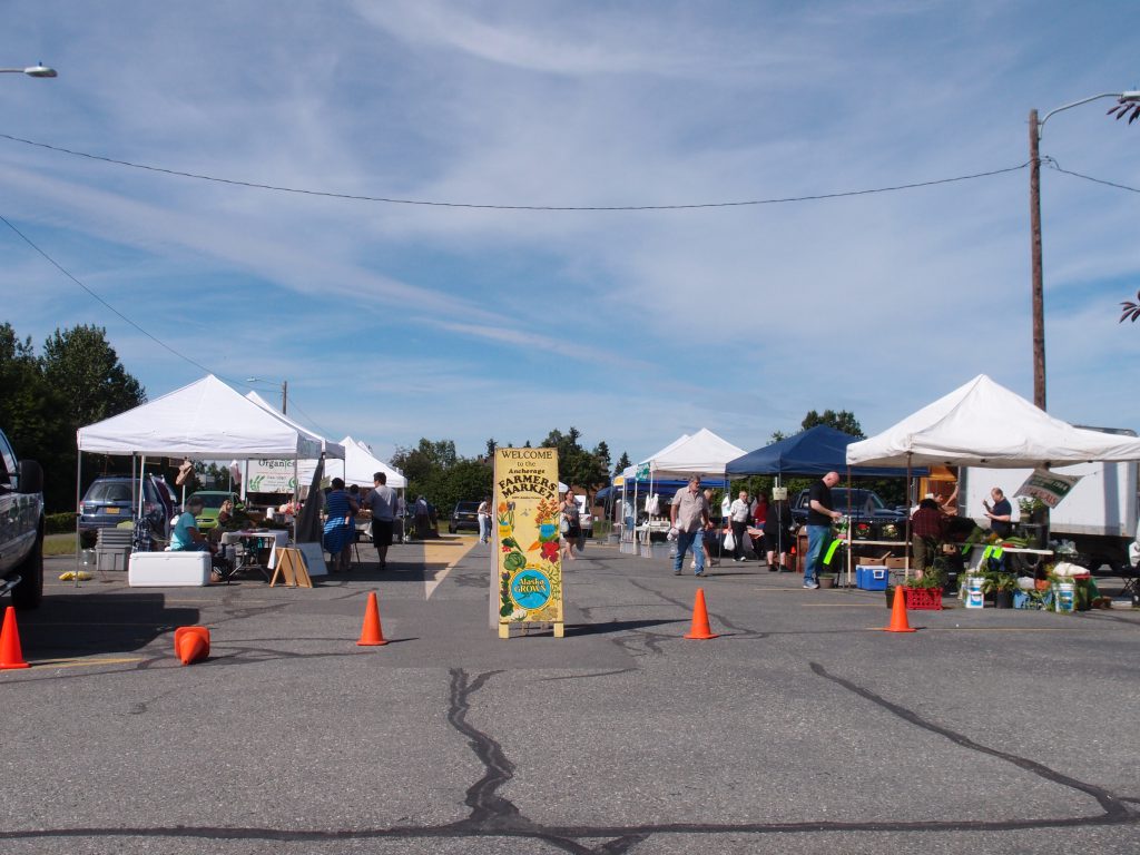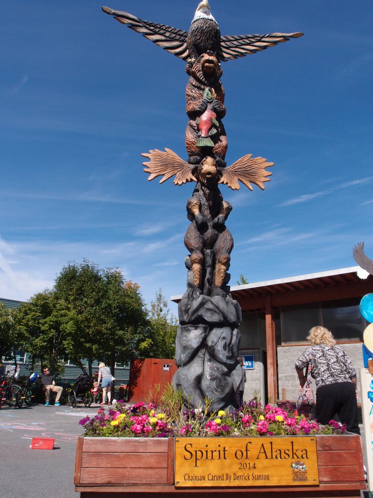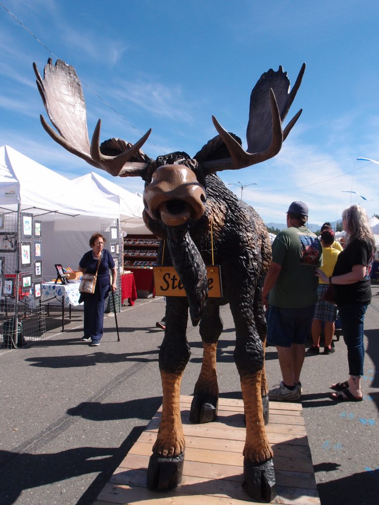 Am nächsten Morgen aufgewacht stellten wir fest, dass wir statt Kamin lieber einen Ventilator gehabt hätten, da es tatsächlich fast 30 Grad Celsius warm war. In der Hoffnung, dass es draußen angenehmer war, stürmten wir in die Stadt und fanden schnell heraus, dass die Einwohner Anchorages in den Sommermonaten am Wochenende den Anchorage Market & Festival ansteuerten. Also folgten wir ihnen zu einem Platz mit etwa 300 Ständen. Am Eingang des Marktes begrüßte uns ein Elch. Erwartung bezüglich Tiere - check (?)